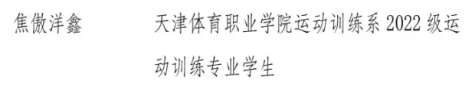 近日,在五四青年节即将到来之际,共青团天津市委员会下发《关于表彰第23届“天津青年五四奖章(集体)”、2024年“天津市五四红旗团委(团支部)”、“天津市优秀共青团员”、“天津市优秀共青团干部”的决定》(津团发〔2024〕5号),其中我院运动训练系2022级学生焦傲洋鑫荣获“天津市优秀共青团员”荣誉称号。