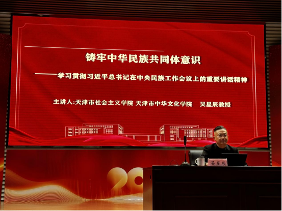 为深入学习贯彻党的二十届三中全会精神,深刻领会习近平总书记关于加强和改进民族工作的重要思想,贯彻落实习近平总书记关于铸牢中华民族共同体意识的重要论述,引导广大师生牢固树立中华民族共同体理念,促进各民族交往交流交融,建设中华民族共有精神家园。11月13日下午,我院邀请天津市社会主义学院 天津市中华文化学院吴星辰教授作铸牢中华民族共同体意识专题培训。学院领导班子、教职工代表、少数民族学生及2024级学生代表参加专题培训。