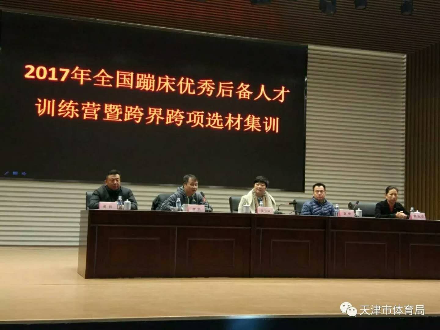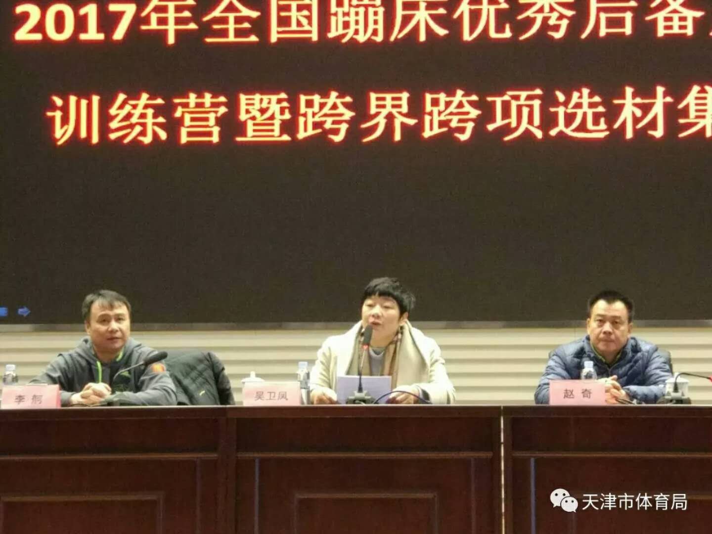 11月24日上午,2017年全国蹦床优秀后备人才训练营暨跨界跨项选材在团泊体育中心举行开营仪式。天津市体育局副巡视员吴卫凤,国家体育总局体操运动管理中心蹦床部部长李舸,天津市体操运动管理中心主任赵奇、副主任窦淑云、苏裕出席了开营仪式。