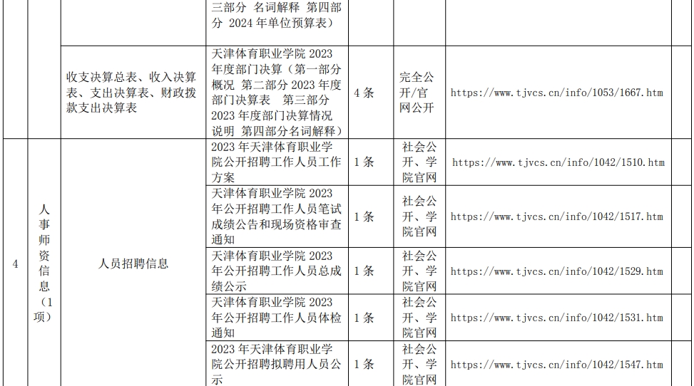 5.按照高等学院信息公开事项清单的要求,学院通过官方网站,对招聘方案、考试通知、成绩公告、聘用人员公示等信息予以公开。教职工职称评审工作,将学院各系列职称评审工作中的评审条件、名额及评审结果按照天津市相关要求及时在学院公告栏进行公示,公示时间不少于5个工作日,让教职工了解、参与和监督评审工作的每一个环节,确保职称评审公开透明、公平公正。