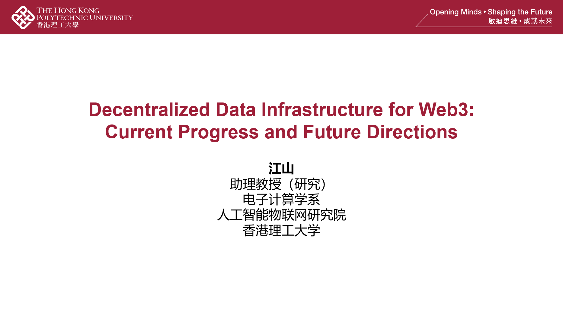 江山现任香港理工大学电子计算学系助理教授(研究),他分别中山大学和香港理工大学获得计算机学士和博士学位。江老师的研究领域包括分布式系统及区块链、基于区块链的数据共享、区块链即服务曾获BlockSys 2021最佳论文奖。