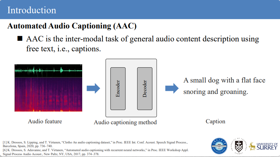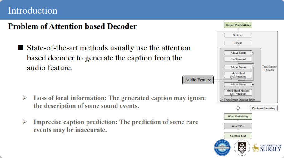 音频语意概述任务致力于用自然语言概述文本(如字幕短句)描述音频数据内容。现有方法通常采用“编码器-解码器”结构构建音频语意概述模型,其中基于注意力机制的解码器结构(如Transformer decoder)被广泛用于解码器设计,并取得了较为不错的性能表现。尽管基于注意力机制的解码器结构能够利用注意力机制有效捕获音频数据的全局信息,但该设计可能会忽略音频信号中的局部信息,进而导致预测概述文本失准。为了解决这一问题,团队提出了一种基于局部信息辅助的解码器结构,通过局部注意力机制,在保留全局信息感知能力时,关注并捕获音频数据中潜在的局部信息,使得局部事件被准确地预测表述,并由此构建了音频语意概述模型,提升音频语意概述性能表现。