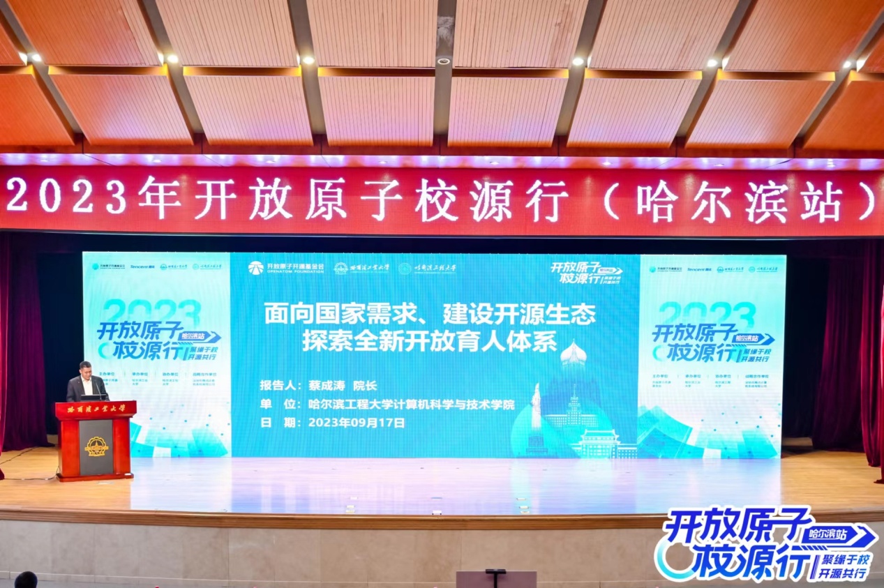 在会议的三个主题分享报告中,计算机学院院长蔡成涛教授在大会上做了“面向国家需求、建设开源生态,探索全新开放育人体系”的主题报告,介绍了学院对开源的认知、探索及实践情况,其中重点介绍了学院开源育人体系的建设情况,在与会各兄弟院校、开源基金会和企业中引发了强烈反响和一致好评。
